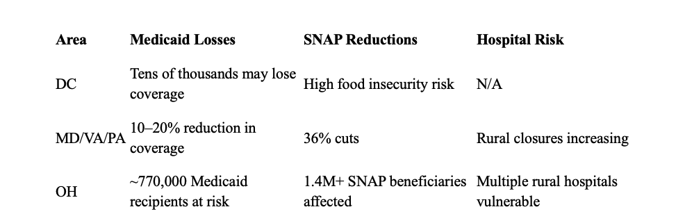 • Healthcare Access: Millions losing Medicaid coverage, particularly in rural and underserved areas—including veterans and children.